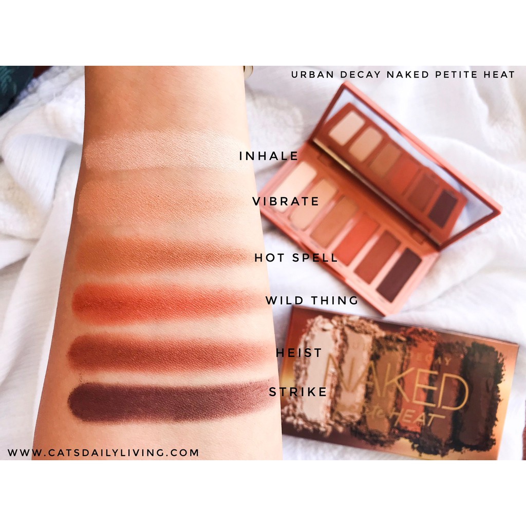 - 6 màu của Naked Petite Heat Palette mang tên: Inhale, Vibrate, Hot Spell, Wild Thing, Heist, Strike. Trong đó, 3 gam màu nổi trội là Hot Spell mang màu sắc của đât nung, Strike là một màu nâu đỏ quyến rũ, Wild Thing cam cháy.