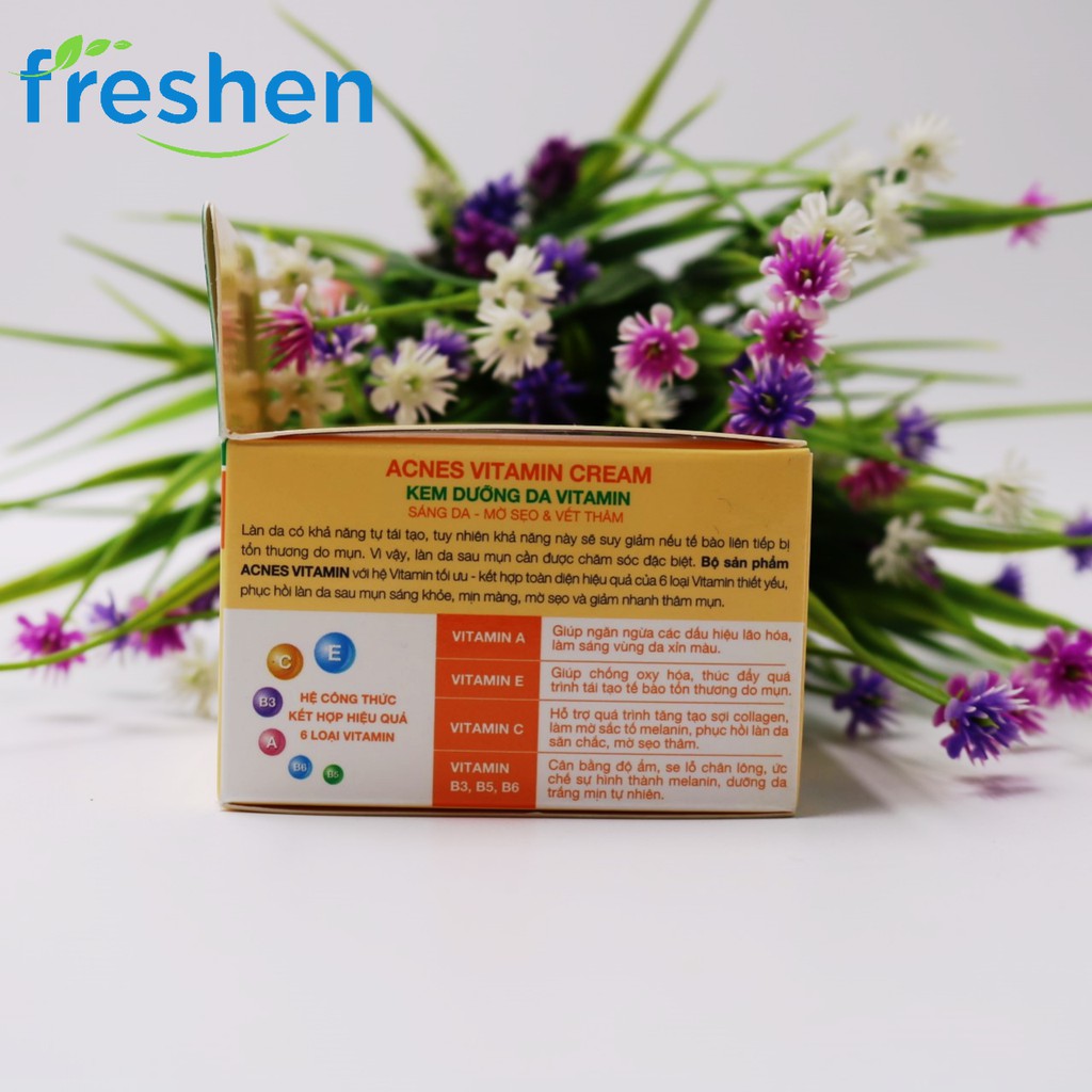 - Acnes Vitamin Cream cung cấp 6 Vitamin và Acid amin thiết yếu nuôi dưỡng và phục hồi làn da sau mụn.