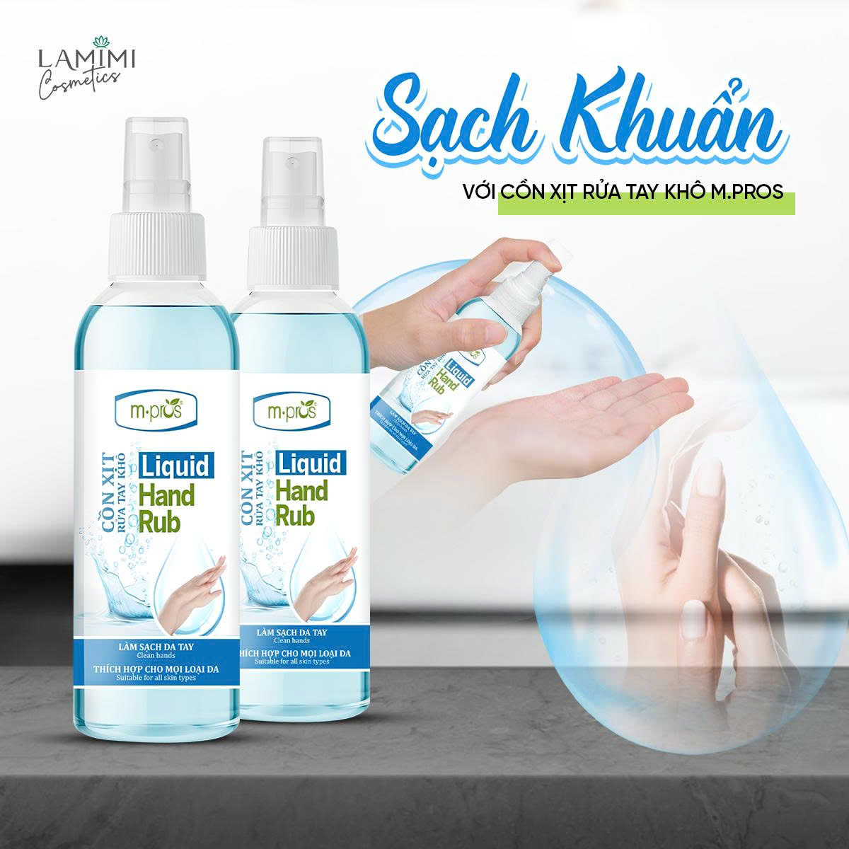 Cồn xịt rửa tay khô M.Pros Liquid Hand Rub là sản phẩm giúp làm sạch đôi tay siêu nhanh mà không cần dùng nước, bảo vệ da tay khỏi 99,9% vi khuẩn gây bệnh, đồng thời bổ sung hoạt chất dưỡng ẩm cho da tay. Hương thơm tự nhiên, nhẹ nhàng, dễ chịu.