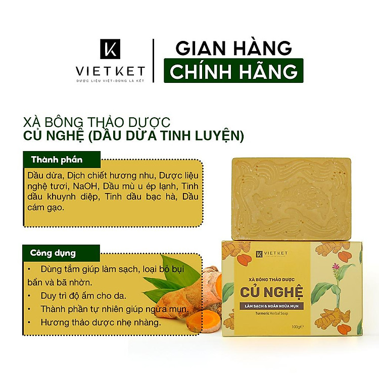 Xà bông thảo dược Củ Nghệ VIETKET là sự kết hợp tinh túy của các loại tinh dầu, thảo dược có thành phần tự nhiên dưới bàn tay của VIETKET