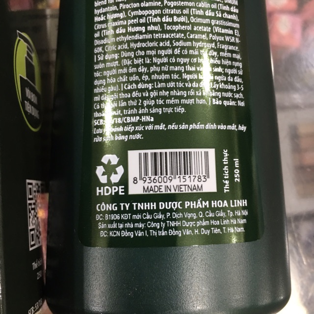 Chiết xuất dược liệu : Bồ kết, Cỏ mần trầu, Dâu tằm, Núc nác, Cỏ ngũ sắc, Hà thủ ô, Bạch quả, tinh dầu hoắc hương, tinh dầu sả chanh, tinh dầu bưởi, tinh dầu hương nhu, dầu Olive, vitamin E