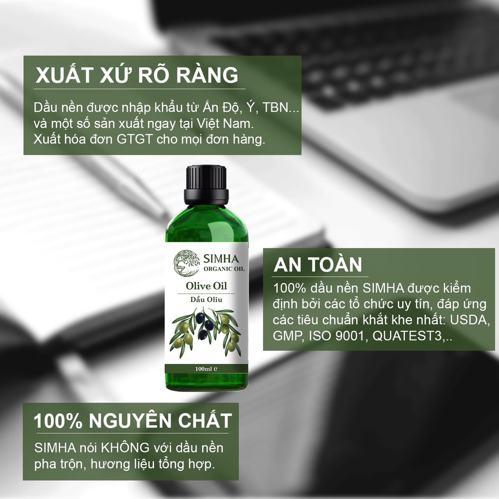 - Dầu Oliu SIMHA được chiết xuất từ quả Oliu. Chứa lượng lớn axit béo có lợi cho cơ thể. Đồng thời, chứa nhiều loại vitamin như A, D, F, K, các loại vitamin giúp dung hoà chất béo, chất carotine và chất chống oxy hoá nhưng lại không chứa cholesterol, nên khả năng hấp thụ và tiêu hoá vào trong cơ thể là rất lớn
