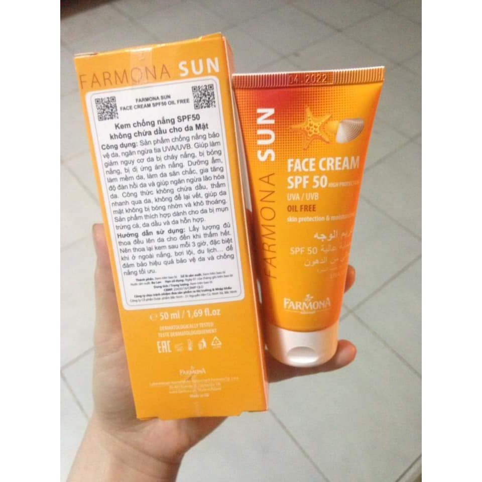✔ Kem Chống Nắng nâng tone Farmona với chỉ số SPF 50+ và PA+++, Kem Chống Nắng Kiềm dầu Farmona Sun Face Cream SPF50 Oil Free 50ml giúp chống nắng bảo vệ da khỏi cả tia UVA và UVB, ngăn ngừa tình trạng bỏng nắng, thâm sạm da, nám tàn nhang, lão hóa da, dưỡng da mịn màng.