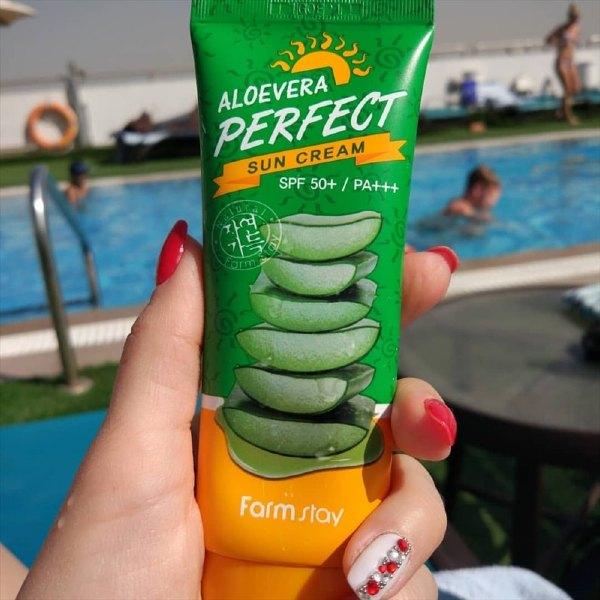 • Farm Stay Aloevera Perfect Sun Cream SPF50+ PA+++ chống nước và mồ hôi. Vậy nên rất thích hợp sử dụng cho những chuyến đi dã ngoại, du hí với người thân, bạn bè trong mùa hè này.
