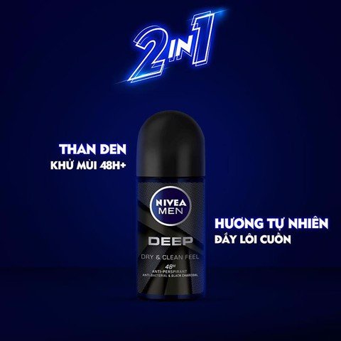 6. Lăn Khử Mùi Cho Nam Than Hoạt Tính Hương Gỗ Đen Nivea Men Deep Dry & Clean Feel Anti-Perspirant Roll On Công thức thành phần than đen hoạt tính chứa 2 lần sức mạnh giúp hút và khóa mùi cơ thể tối đa, giảm tiết mồ hôi hiệu quả suốt 48h cùng hương gỗ nam tính hiện đại.