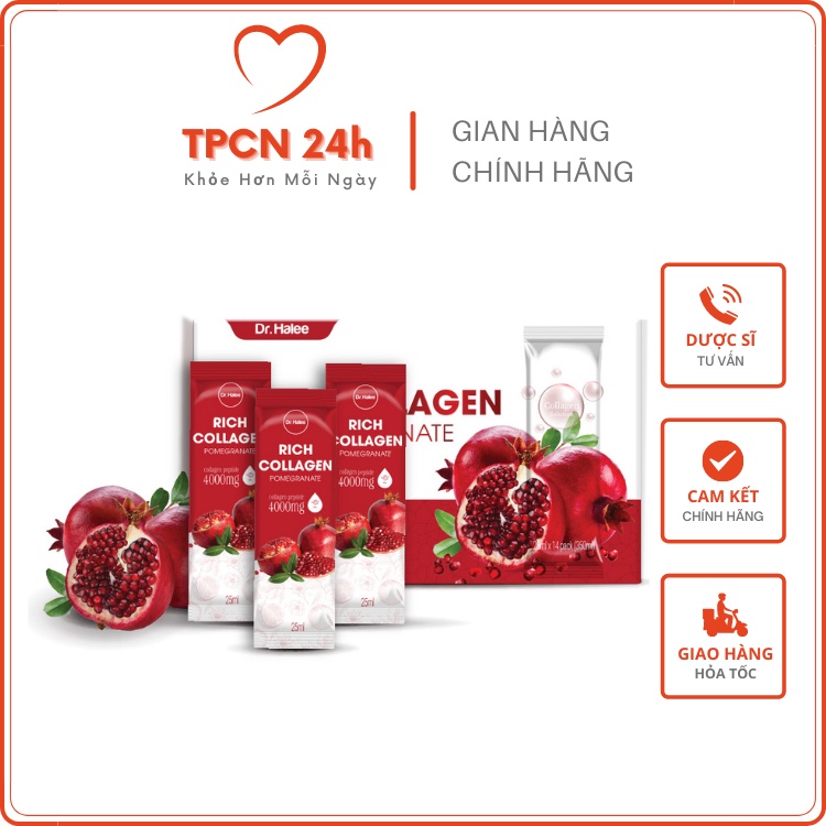 Rich Collagen Pomegranate của Dr Halee được nghiên cứu và sản xuất theo dạng Collagen thủy phân cao cấp. Giúp cải thiện độ đàn hồi cấu trúc da từ bên trong.