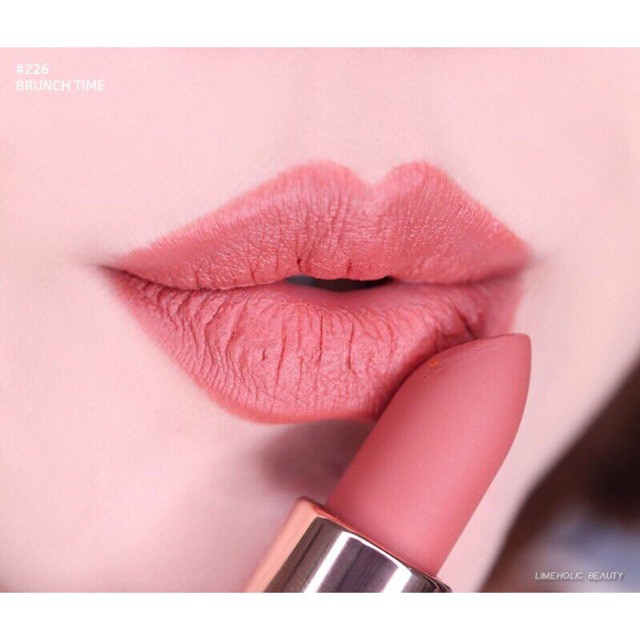 👉Son 3CE 226 là màu son nhạt nhất trong số 3 màu son mới của 3CE. Tuy nhiên, khác với màu 119 (Hold On) năm ngoái, màu son lần này không quá bợt. 3CE 226 Brunch Time là sự pha trộn giữa nude đất, cam và chút hồng, vì thế, bạn dù không trang điểm cầu kỳ vẫn có thể yên tâm đánh son mà chẳng cần lo lắng là mặt sẽ nhợt nhạt. Đây cũng là màu son thích hợp để dùng hàng ngày, phù hợp với cả nhóm học sinh, sinh viên lẫn các cô nàng công sở bận rộn