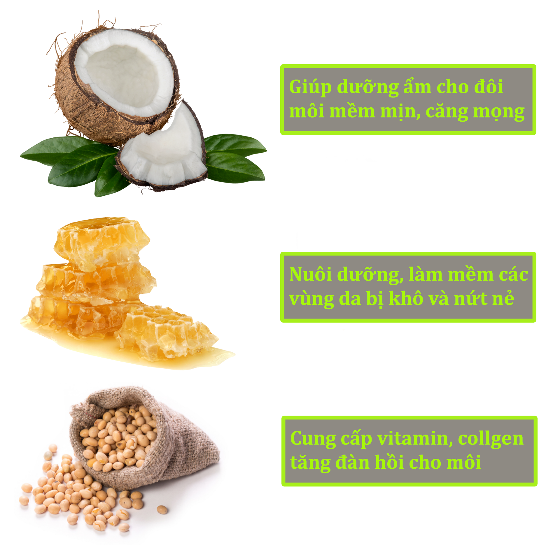 • Sáp đậu nành: lành tính có công dụng dưỡng ẩm, tăng đàn hồi, tăng cường quá trình sản xuất collagen, cung cấp vitamin, tăng đàn hồi cho da và môi.