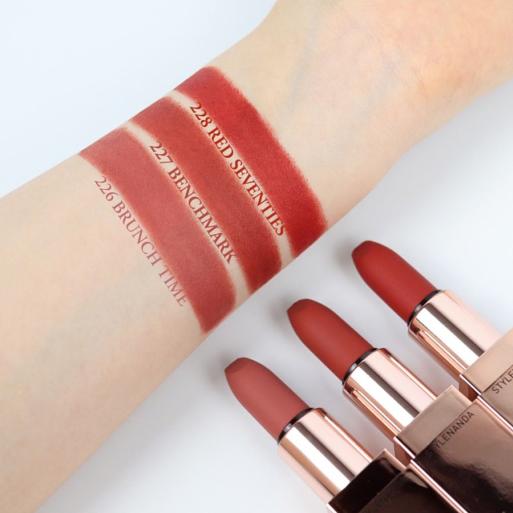 Màu 228 (Red Seventies) – đỏ đất: Tông đỏ pha nâu và đất nên không hề chóe nhưng vẫn đủ để bạn nổi bật giữa đám đông. Đây là một tông son đỏ có thể chiều lòng tất cả mọi người, sử dụng được trong nhiều hoàn cảnh. Màu này đánh lên môi làm môi đầy, tôn lớp trang điểm trên mặt bạn. Đảm bảo bạn sẽ cảm thấy xao xuyến ngay khi đánh son lên môi nhé. Màu này chắc chắn sẽ là màu bán chạy nhất noel lần này đấy.