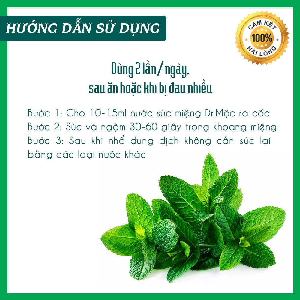 ♻️ Cách dùng: Dùng sau khi chải răng và sau khi ăn: Súc miệng với nước súc miệng Dr Mộc 10-15ml/lần, trong vòng 30 giây. Sử dụng 2-3 lần/ngày.