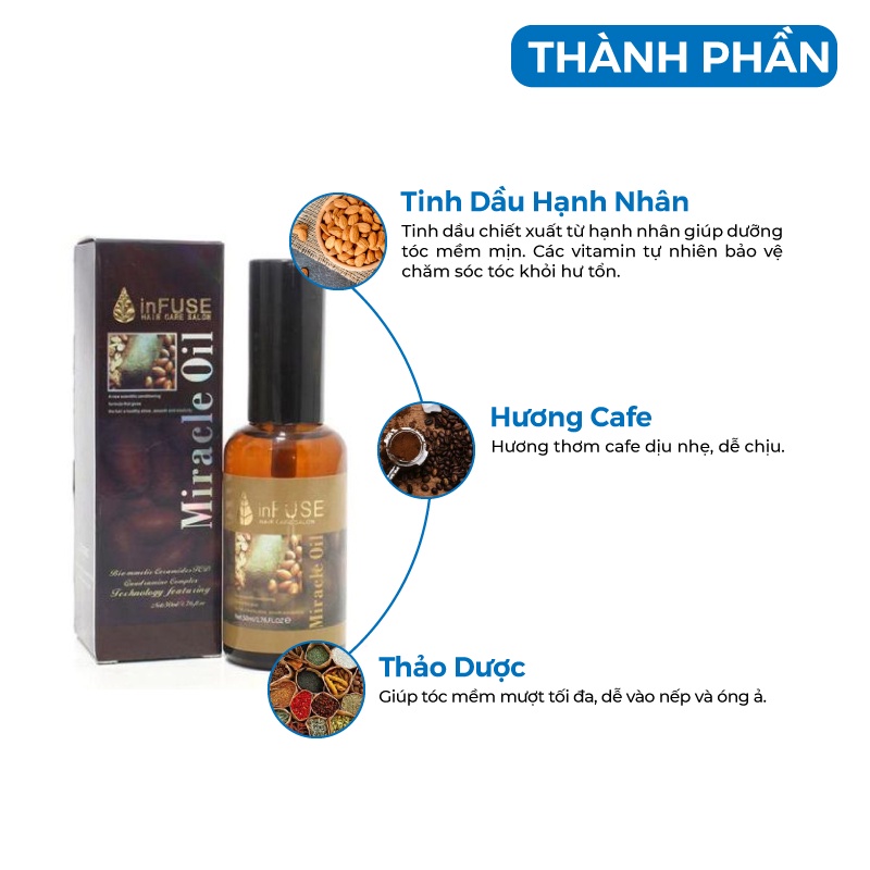 Tinh dầu dưỡng MIRACLE OIL giúp mái tóc óng mượt, bảo vệ hư tổn trong cấu trúc tóc, giúp tóc mềm lại óng đặc biệt và tóc xoăn rất phù hợp. Dùng rất phù hợp cho mùa đồng , kết hợp với mùi thơm quyến rũ.