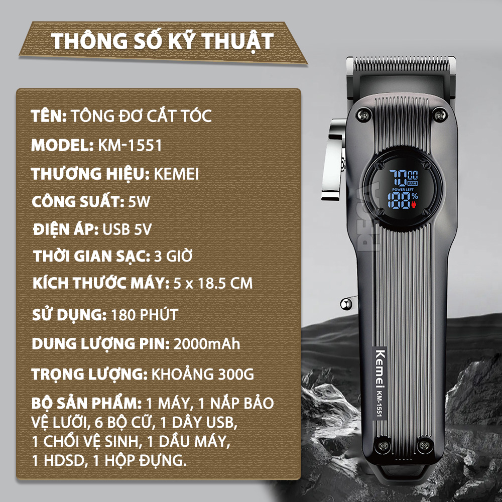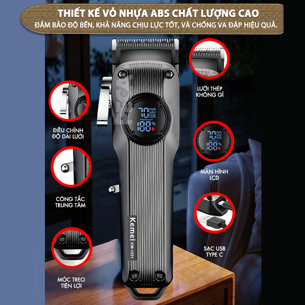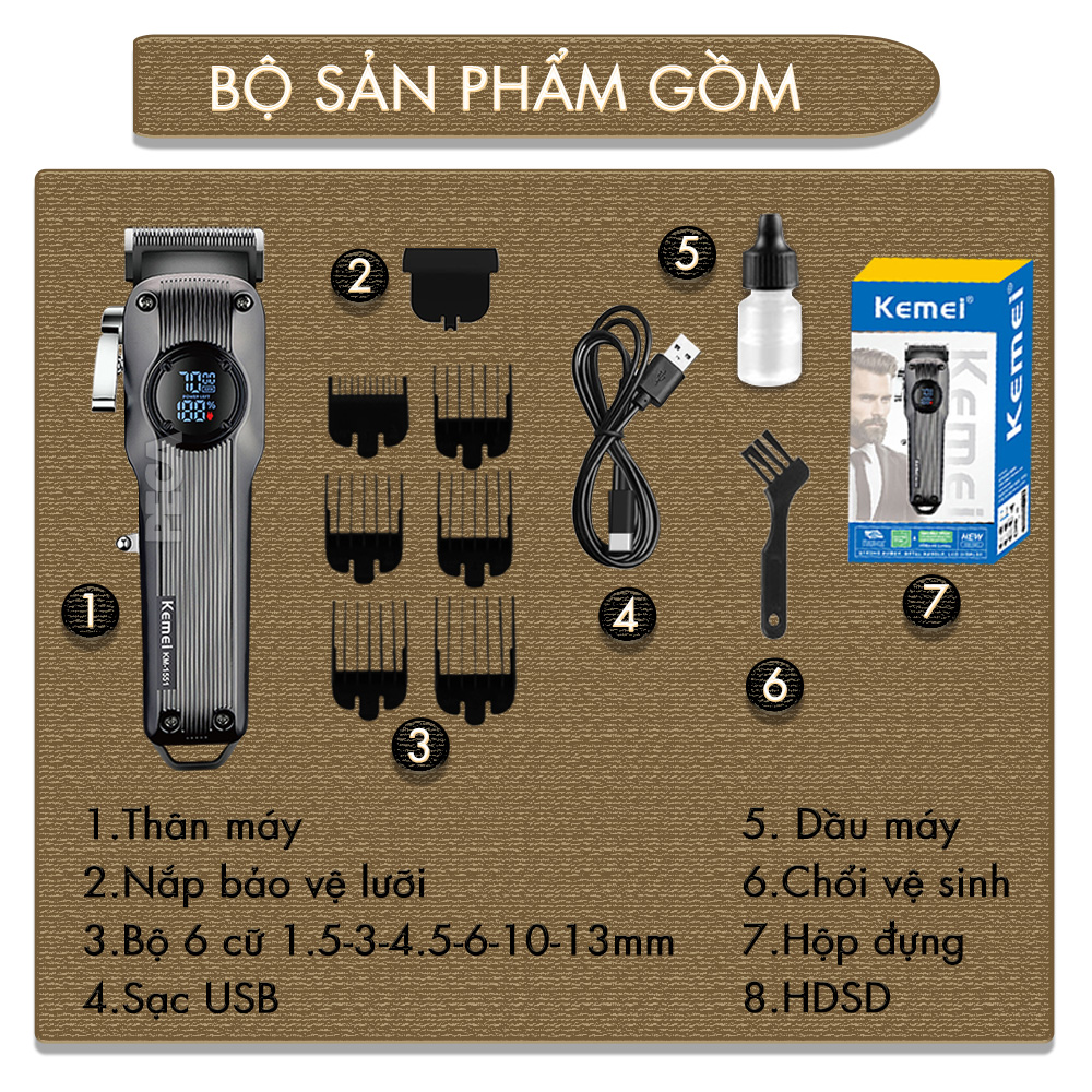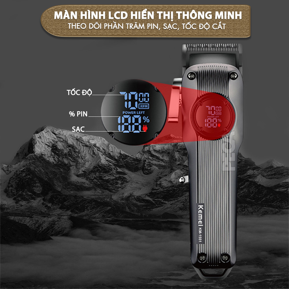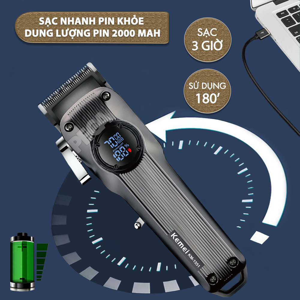 Giới thiệu Tông đơ cắt tóc chuyên nghiệp Kemei KM-1551 công suất mạnh 5W màn hình LCD sạc nhanh USB type C tiện lợi - Chính hãng