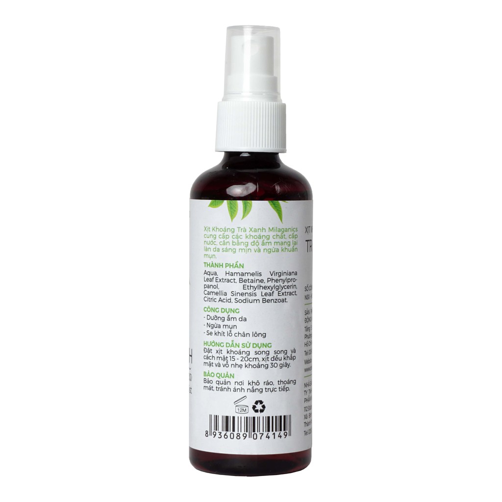 Xịt khoáng trà xanh Milaganics có thành phần chiết xuất hoàn toàn từ trà xanh tự nhiên kết hợp với tinh chất cây phỉ, giúp cấp nước tức thời, làm dịu, tái tạo tế bào da và hỗ trợ ngăn ngừa mụn hiệu quả.